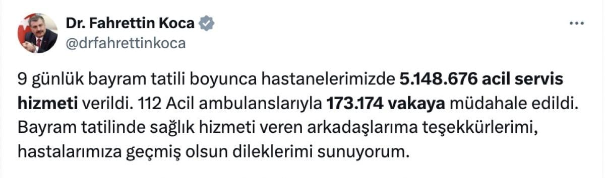 9 günlük bayram tatili boyunca hastanelerimizde 5 milyon 148 bin 676 acil servis hizmeti verildi. 112 Acil ambulanslarıyla 173 bin 174 vakaya müdahale edildi. Bayram tatilinde sağlık hizmeti veren arkadaşlarıma teşekkürlerimi, hastalarımıza geçmiş olsun dileklerimi sunuyorum.
