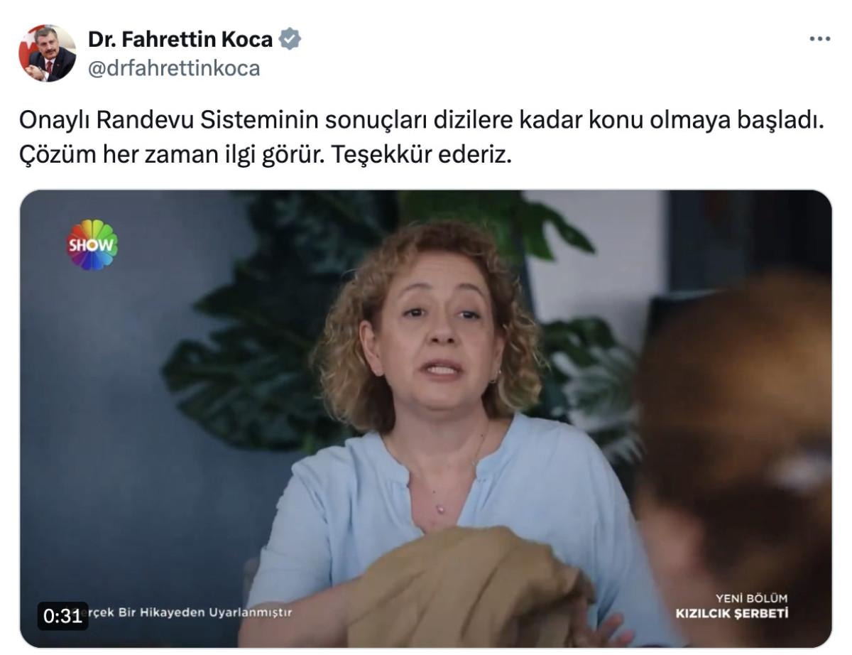 Koca paylaşımına, "Onaylı Randevu Sisteminin sonuçları dizilere kadar konu olmaya başladı. Çözüm her zaman ilgi görür. Teşekkür ederiz" notunu düştü.