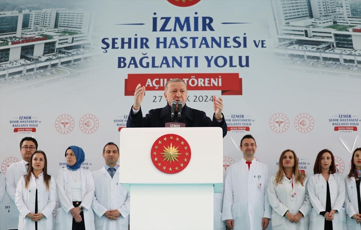 Erdoğan, İzmir'i altyapı sorunlarından kurtaracaklarını de belirtti. İleri tıp teknolojilerine ve gelişmiş olanaklara sahip 2 bin 60 yataklı İzmir Şehir Hastanesi, toplam 628 bin 15 metrekare kapalı alana sahip hastanenin 337 polikliniği, 54 ameliyathanesi, 374 yoğun bakım yatağı, 30 diyaliz yatağı bulunuyor.