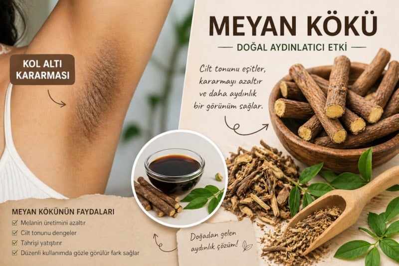 Meyan kökünün içeriğinde bulunan glabridin, melanin (cilt rengi pigmenti) üretimini baskılar ve ciltteki koyu renk oluşumunu azaltır. Bu sayede güneş veya sürtünme kaynaklı kararmaları hafifletir.