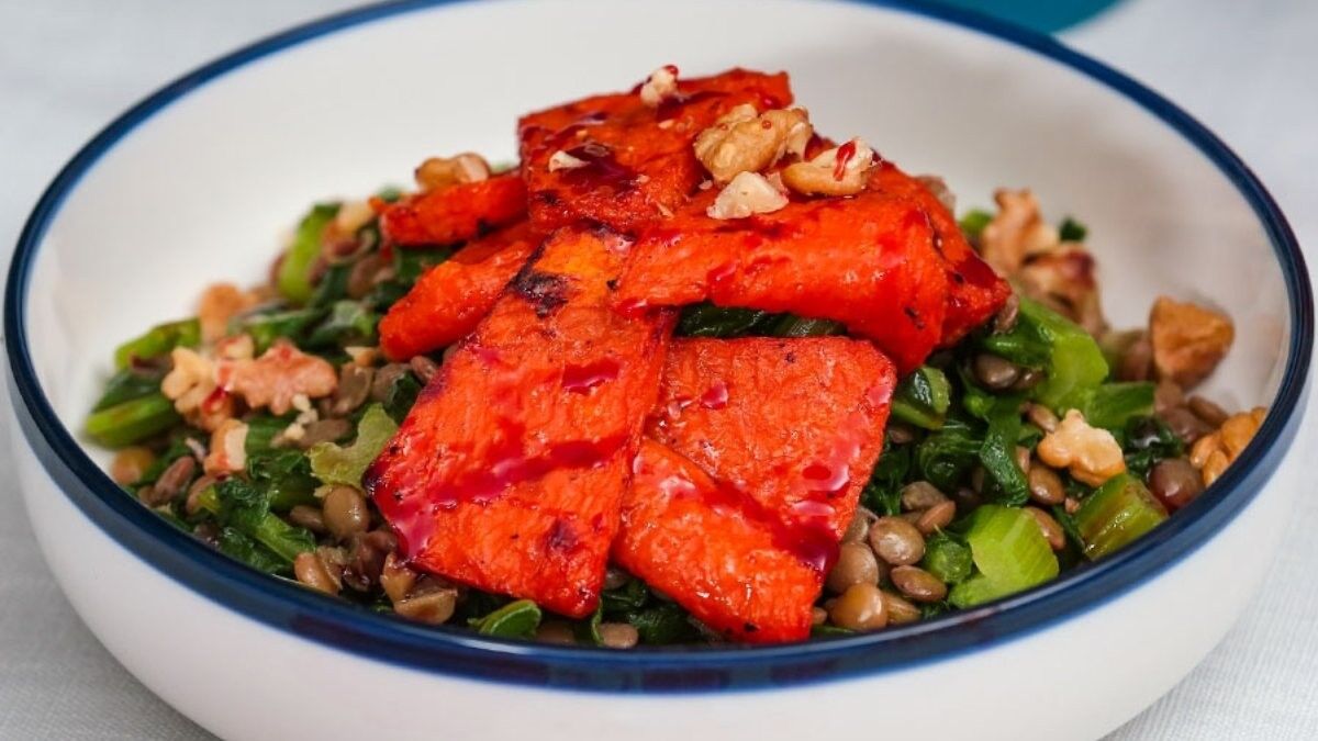 4- Pazılar pişince haşlanmış yeşil mercimeği ve tuzu ilave edip 2-3 dakika daha soteleyin. Pazılı yeşil mercimekleri tabağa alın ve üzerine fırında glaze olan bal kabaklarını yerleştirin.