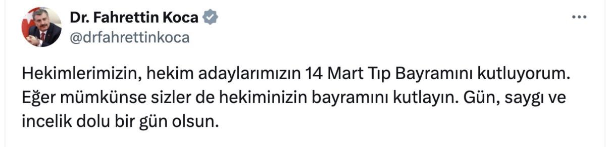 Bakan Koca, sosyal medya hesabından paylaştığı mesajında, "Hekimlerimizin, hekim adaylarımızın 14 Mart Tıp Bayramı'nı kutluyorum. Eğer mümkünse sizler de hekiminizin bayramını kutlayın. Gün, saygı ve incelik dolu bir gün olsun." ifadelerine yer verdi.