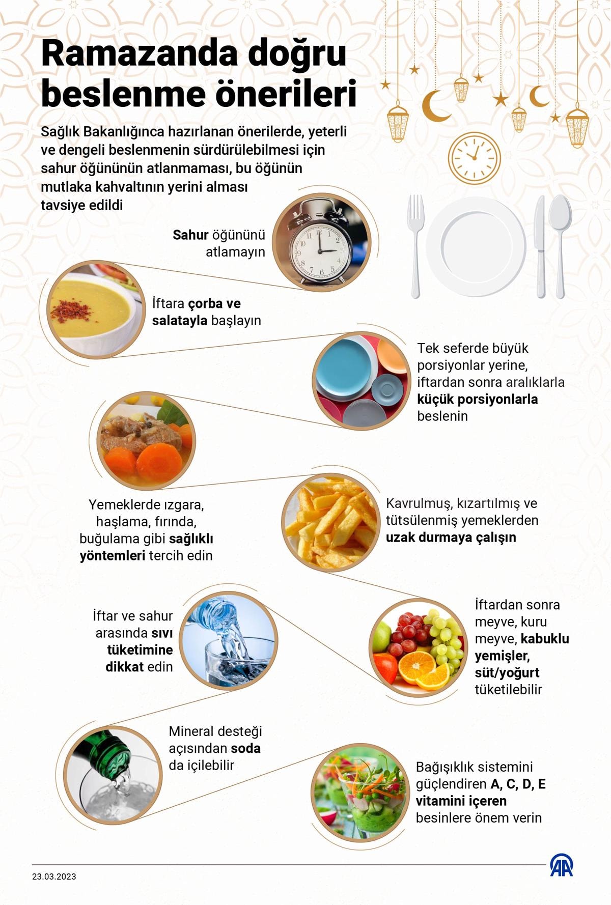 Yeterli ve dengeli beslenmenin sürdürülebilmesi için sahurun atlanmaması, oruç olunmayan saat diliminde en az 2 ana öğün ve ara öğünler yapılarak iftarda ağır yemekten kaçınılması öneriliyor.
