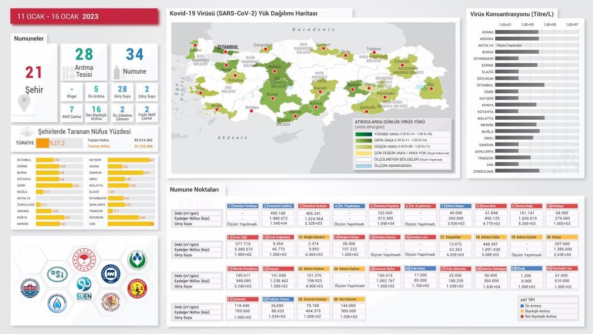 Türkiye’nin koranavirüsle mücadeleye başladığı 2020 yılından itibaren, Türkiye Su Enstitüsü Başkanlığı koordinatörlüğünde atık su arıtma tesisleri giriş ve çıkışlarında kompozit atık su numunelerinde koronavirüs taramaları devam ediyor. 3 yıldır süren çalışmalar kapsamında 21 pilot şehir ve İstanbul’da incelemeler devam ederken, atık sularda koronavirüsün hala görüldüğü de ortaya çıktı. Bölgelerdeki hastalıkta artış, azalış, sabit gidiş takibinin yapıldığı çalışmaları, hazırlanan haritalar üzerinden de takip etmek mümkün hale geldi. Geliştirilen sistemin, deprem bölgelerinde olası salgın hastalıklarının tespiti için kullanılmasıyla ilgili de girişimler başladı.