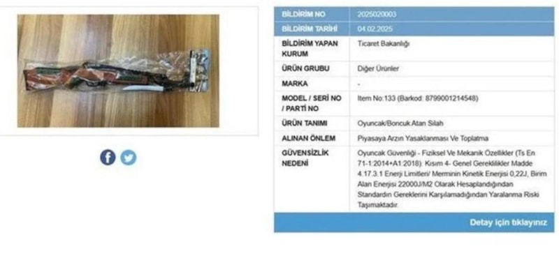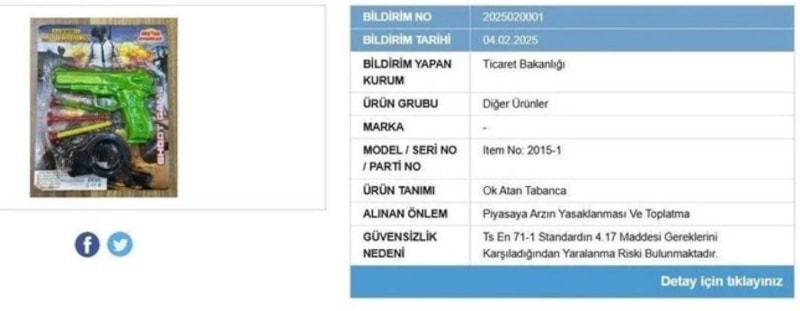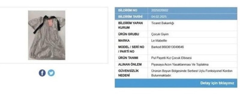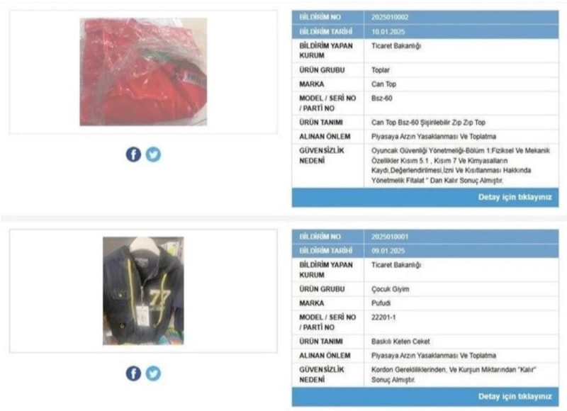 04.02.2025 tarihli bildirime göre, güvensiz bulunarak piyasadan çekilen ürünler arasında yalnızca bebek kıyafetleri değil, çeşitli oyuncaklar da bulunuyor. Daha önce de: