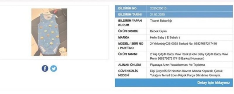 Ticaret Bakanlığı, piyasa denetim faaliyetleri kapsamında yapılan incelemeler sonucu, çocuk sağlığını tehdit eden ürünleri Güvensiz Ürün Bilgi Sistemi (GÜBİS) üzerinden duyurmaya devam ediyor. Son açıklamada, Hello Baby (E Bebek) markasına ait, mavi renkli 2 yaş çıtçıtlı body’nin (barkod numarası: 86827667217416) güvensiz olduğu tespit edilerek piyasadan toplatılmasına karar verildi.