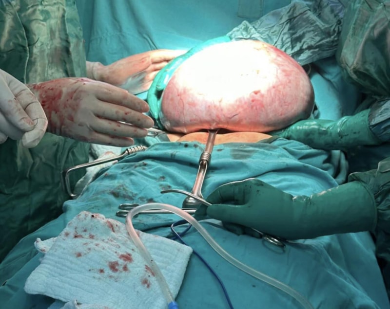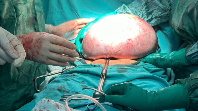 Karın ve bel ağrısı şikayetiyle hastaneye başvuran yaşlı kadının karnından 10 kilo ağırlığında, 30 santimetre çapında tümör çıkartıldı.
