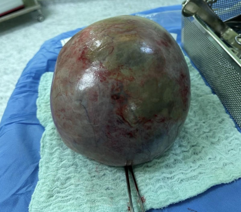Ameliyata alınan Kara’nın karnından 10 kilo ağırlığında, 30 santimetre çapında tümör olduğu tespit edilen kitle çıkartıldı.