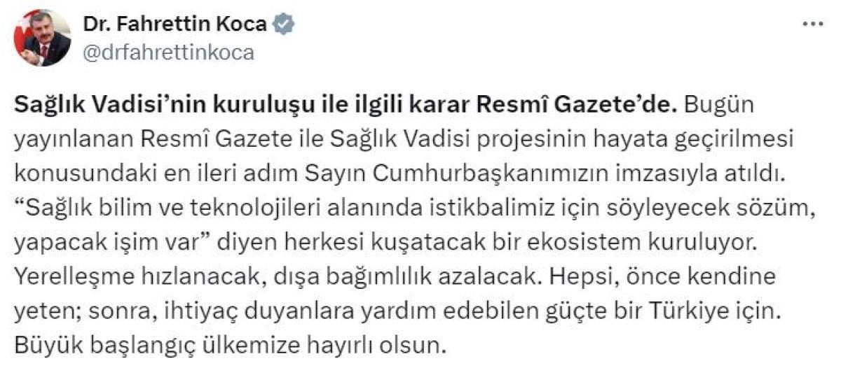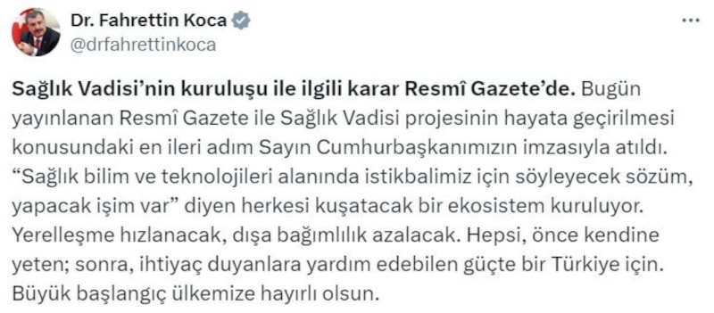 Sağlık Bakanı Fahrettin Koca, Sağlık Vadisi'nin kuruluşuyla ilgili karara ilişkin sosyal medya hesabından yaptığı paylaşımda şunları kaydetti: