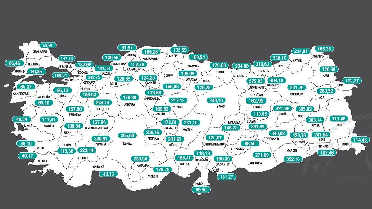 "Rize 538,1, Bingöl 421,98, Batman 420,78, Bayburt 404,1, Aksaray 358,15, Konya 355,6, Mardin 352,16, Diyarbakır 340,02, Isparta 330,91, Trabzon 310,63, Muş 305,02, Bitlis 303,14, Elazığ 291,69, Gümüşhane 275,93, Şanlıurfa 271,69, Ağrı 263,52, Sivas 249,1, Eskişehir 244,14, Sakarya 242,75, Siirt 241,64, Karaman 236,94, Artvin 234,81, Kayseri 231,1, Burdur 223,14, Yozgat 217,13, Giresun 204,8, Niğde 201,62, Erzurum 201,25, Mersin 176,75, Ankara 176,38, Kırıkkale 173,66, Nevşehir 172,81, Iğdır 172,37, Ordu 170,08, Kırşehir 169,52, Çorum 168,83, Adana 168,41, Ardahan 165,35.