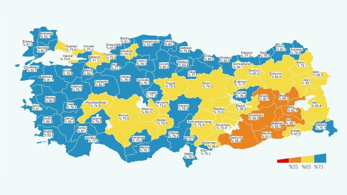 "Karabük (yüzde 74,9), Sivas (yüzde 74,9), Afyonkarahisar (yüzde 74,5), Yalova (yüzde 73,6), İstanbul (yüzde 73,4), Nevşehir (yüzde 73,2), Düzce (yüzde 72,9), Kahramanmaraş (yüzde 72,9), Yozgat (yüzde 72,6), Kars (yüzde 72,1), Malatya (yüzde 72), Erzincan (yüzde 71,7), Sakarya (yüzde 71,1), Konya (yüzde 70,8), Niğde (yüzde 70,8), Adıyaman (yüzde 70,5), Gaziantep (yüzde 69,4), Van (yüzde 69,4), Aksaray (yüzde 69,3), Erzurum (yüzde 69,3), Gümüşhane (yüzde 69,1), Iğdır (yüzde 68,5), Şırnak (yüzde 67,5), Elazığ (yüzde 66,2), Bayburt (yüzde 65,6), Ağrı (yüzde 65,1)."