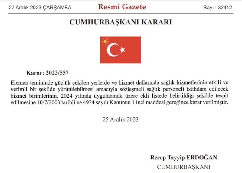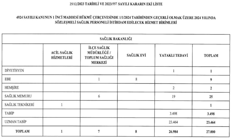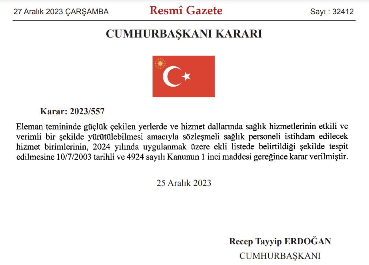 Kararda, 2024 yılında sözleşmeli sağlık personeli olarak istihdam edilecek personel sayısı belirlendi.