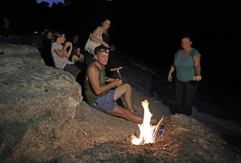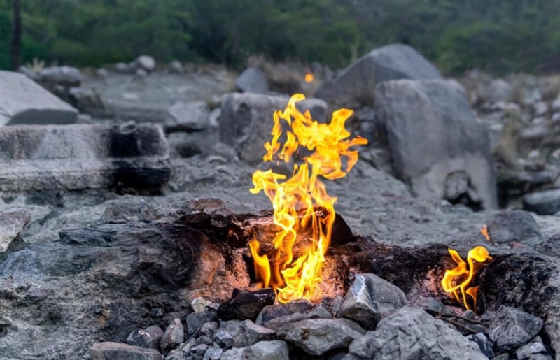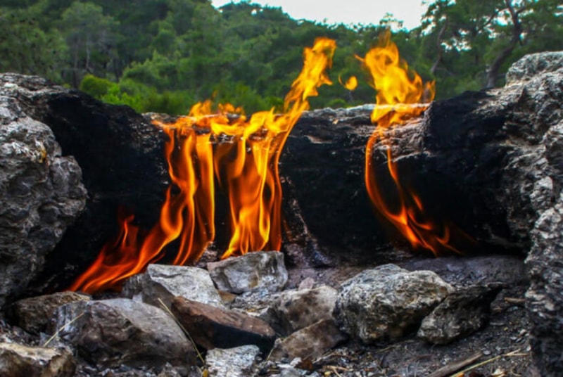 Kayaların arasından metan, etan, azot ve karbondioksit gazları sürekli sızıyor. Bu gazlar havayla temas ettiğinde alev alıyor ve yıl boyunca yanmayı sürdürüyor.