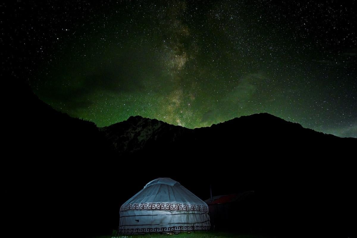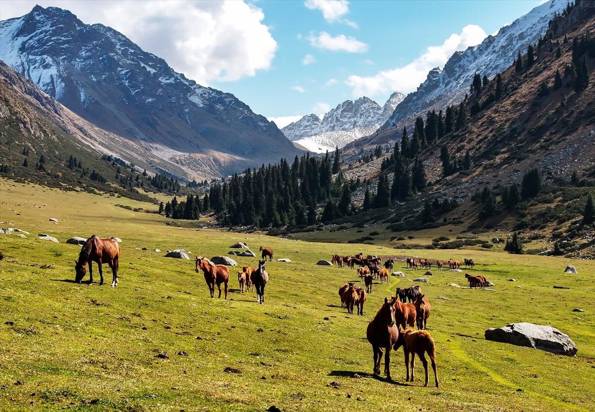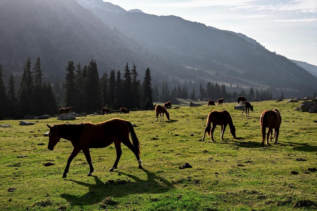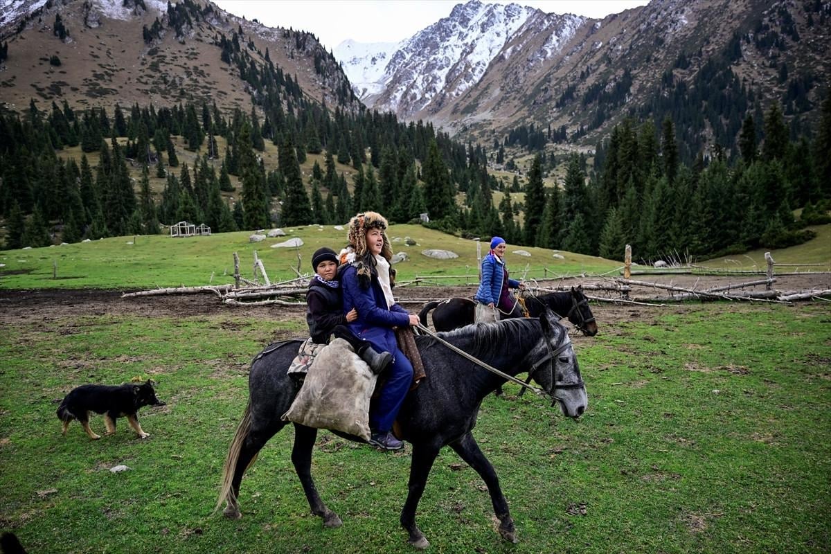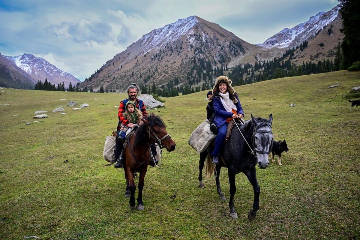 Yolculuk, sadece geçmişe değil, yüksek zirvelere de uzandı. Tanrı Dağları’nın eteklerinde, 4 bin metre rakıma kadar atlarla tırmanan çift, burada geleneksel bir “boz üy” (keçe çadır) kurup yöresel yemekler pişirdi.
