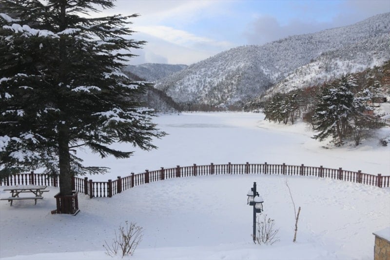 Hava sıcaklıklarının gece saatlerinde sıfırın altına düşmesiyle birlikte Boraboy Gölü’nün yüzeyi tamamen buz tuttu. Kartpostallık görüntüler ortaya çıkarken, göl çevresinde kış manzaraları dikkat çekti.