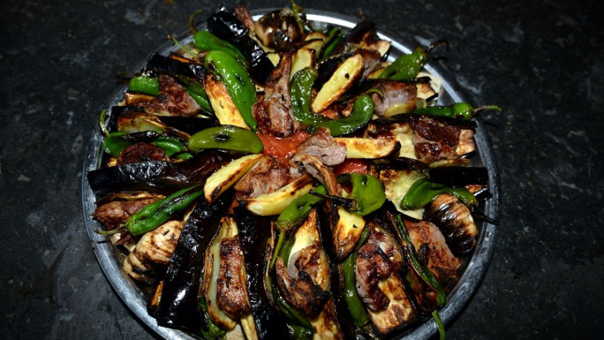 Patlıcan, domates, biber ve kuzu eti sıralı şekilde dizilip taş fırında pişirilir.