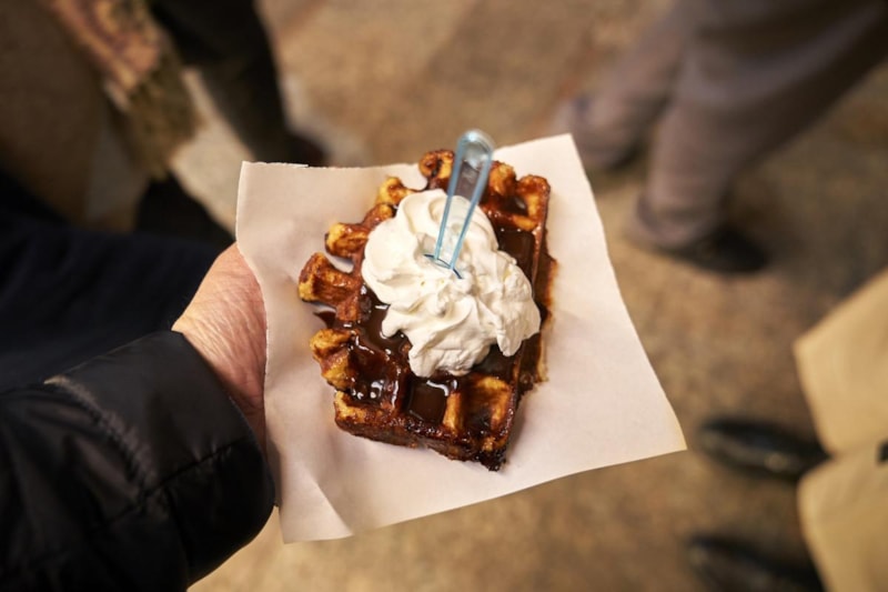 Belçika’nın klasik tatlısı waffle, Türkiye’de daha yumuşak ve bol malzemeli bir sunumla öne çıkıyor. Sokak arabalarında sıcak olarak hazırlanan waffle’lar; çikolata sosları, taze meyveler, renkli şekerlemeler ve kuruyemişlerle süslenerek servis ediliyor.