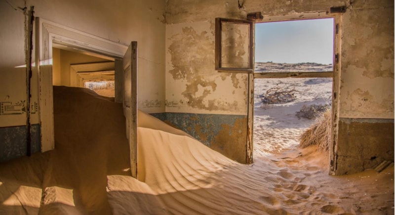 Yerde biriken kum tepecikleri, kapılardan taşan çöl rüzgarı ve yutulmuş mobilyalar…