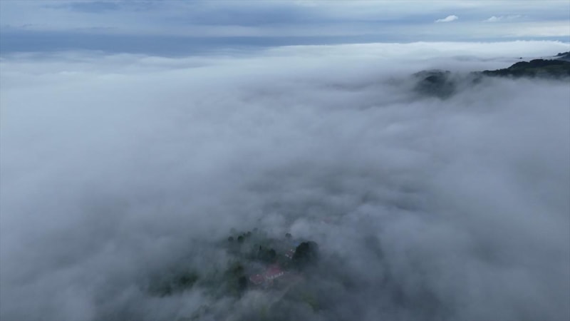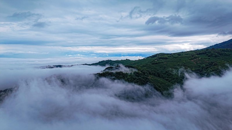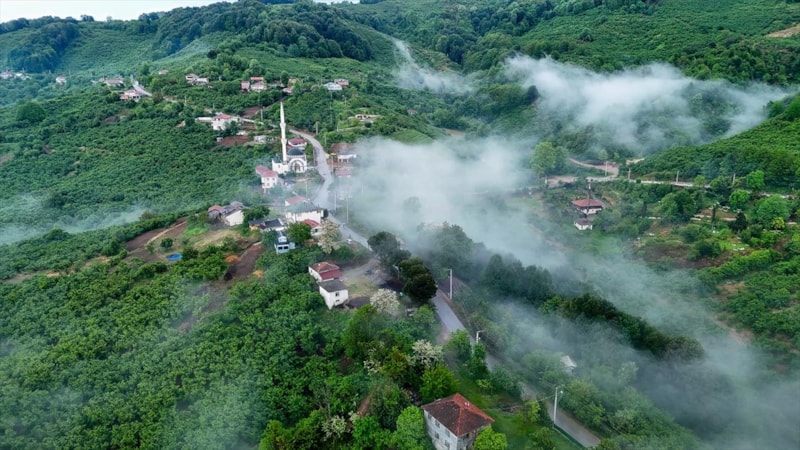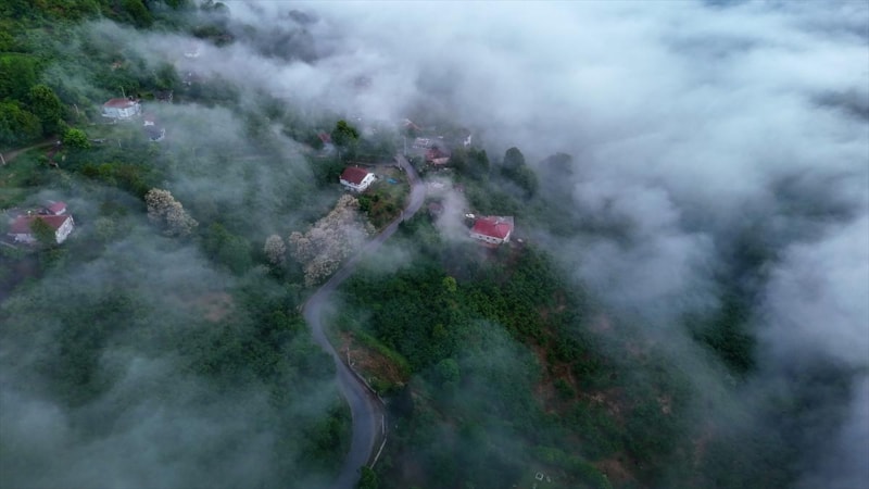 Yeşilin her tonunu barındıran ormanlarla çevrili köylerin üzerine çöken yoğun sis, doğanın gizemli yüzünü gözler önüne serdi. Vadilerden tepelere doğru süzülen bu beyaz örtü, dronla havadan görüntülendi ve kartpostallık kareler ortaya çıktı.
