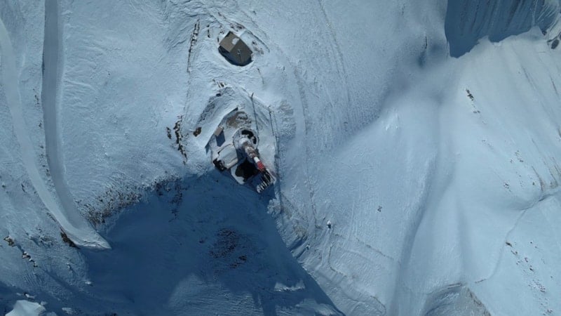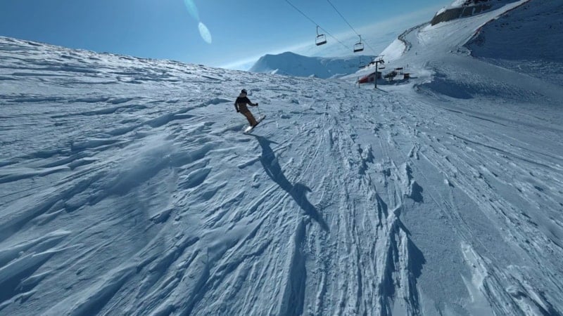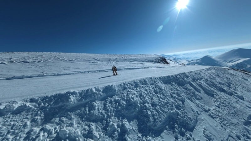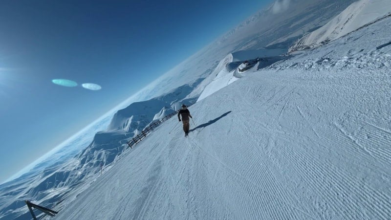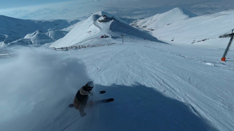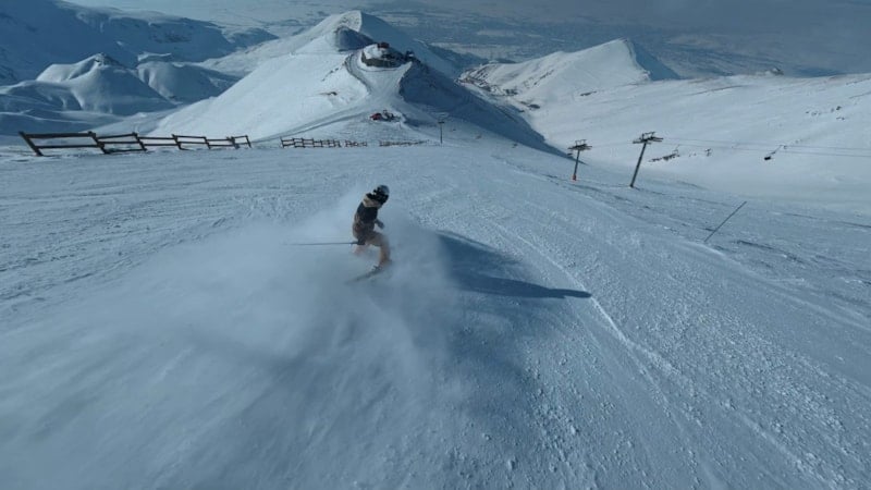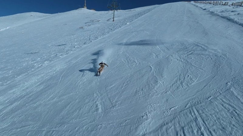 TRT vericisinin bulunduğu noktadan başlayan inişte bir kayakçının karla kaplı zirveden adeta bulutların arasından süzülür gibi ilerlediği anlar, drone'la kaydedildi. Görüntüler, izleyenlere kar üzerindeki hız ve adrenalin dolu anları gözler önüne serdi.