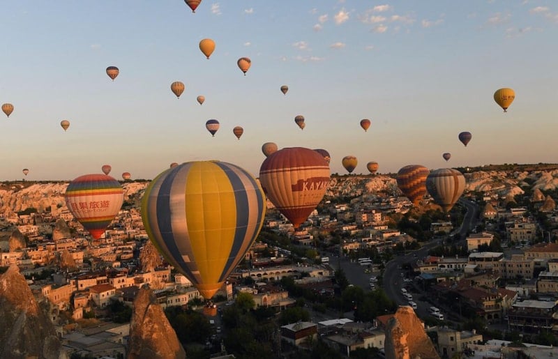 Sabahın erken saatlerinde gökyüzünü süsleyen sıcak hava balonları, renklerin uyumu ve hareketiyle her kareyi canlı bir tabloya dönüştürür.