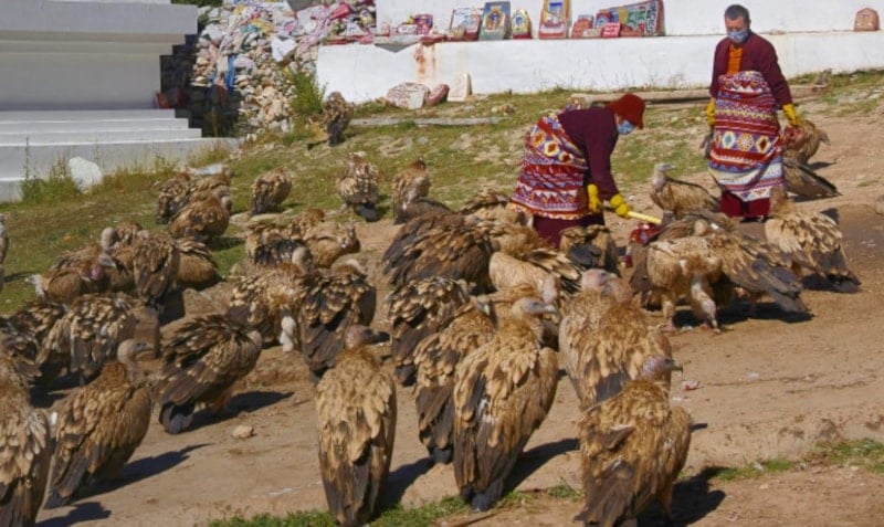 Tibet ve Moğolistan’da, ölü bedenler yüksek dağlara bırakılıyor ve yırtıcı kuşlar tarafından doğaya geri dönüşü sağlanıyor.