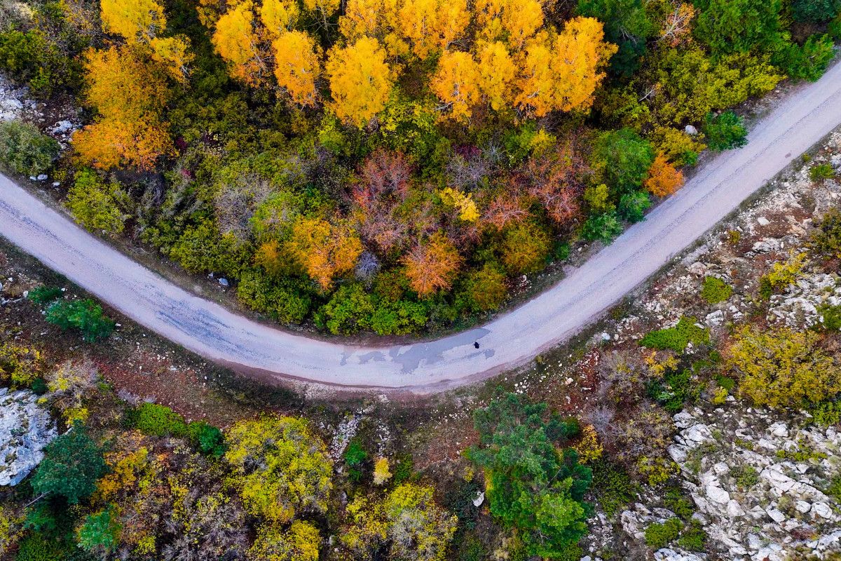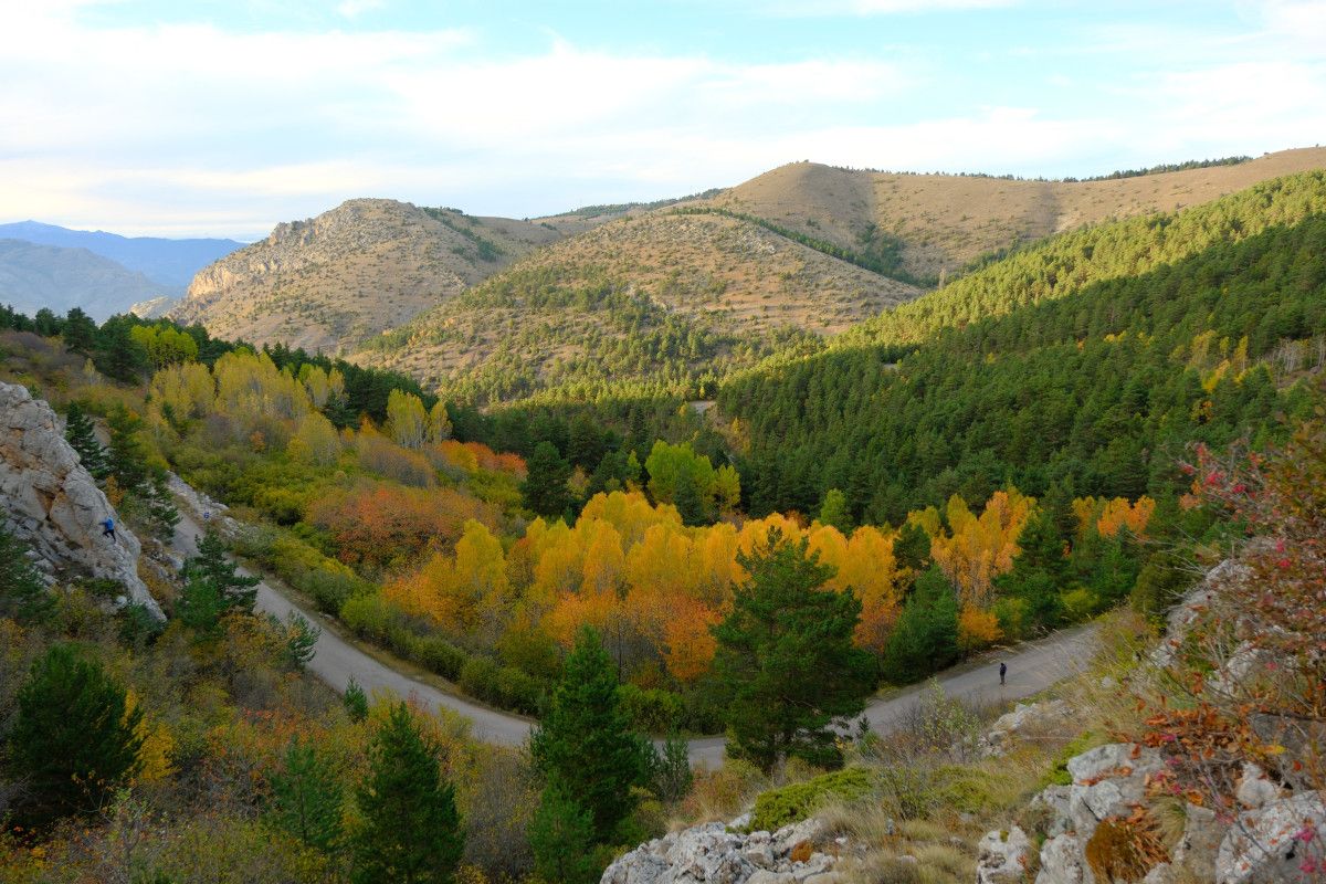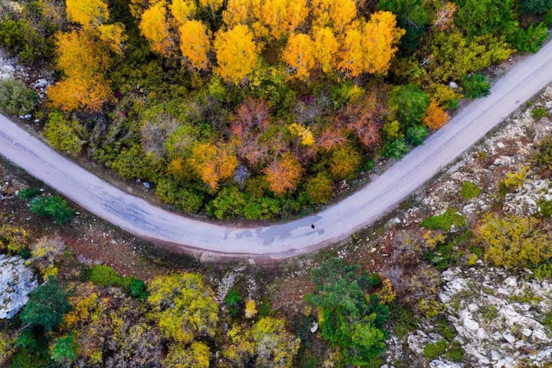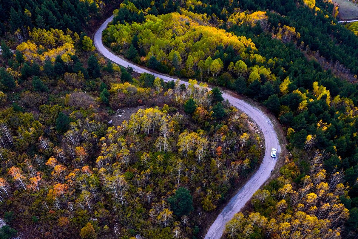Yol boyunca uzanan titrek kavakların altın sarısı yaprakları, sarı çam ormanlarının canlı yeşili ve meşe ağaçlarının kahverengi tonları, doğanın zengin renk paletini gözler önüne seriyor.