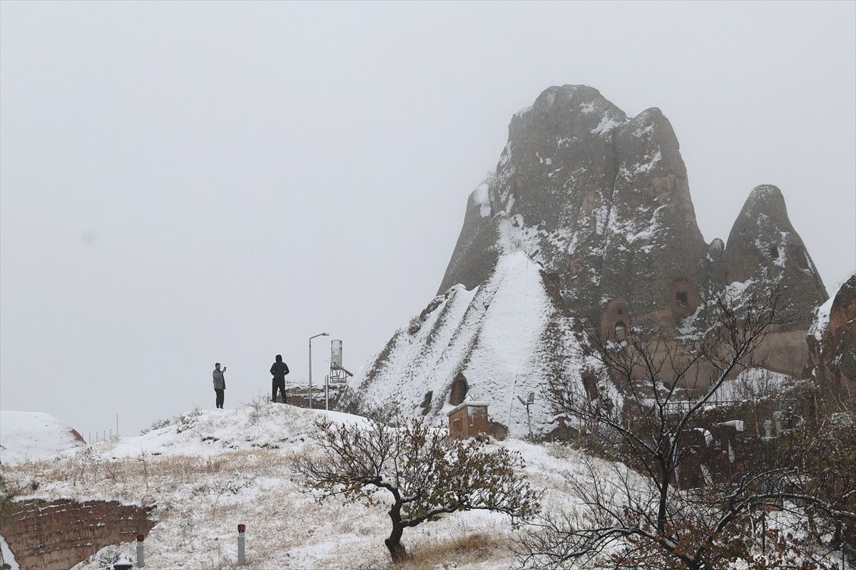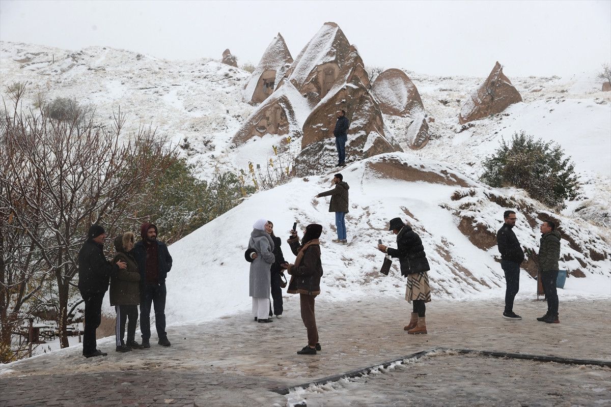 Nevşehir ve çevresinde sabaha karşı etkili olan kar yağışı, Kapadokya’nın peribacaları ve doğal oluşumlarını kısa sürede beyaz bir örtüyle kapladı. Yerli ve yabancı turistler, karla kaplanan vadilerde yürüyüş yapıp bol bol fotoğraf çekerek manzaranın tadını çıkardı. Sonbaharın sararan yaprakları ile karın beyazlığı bir araya gelince ortaya kartpostallık görüntüler çıktı.