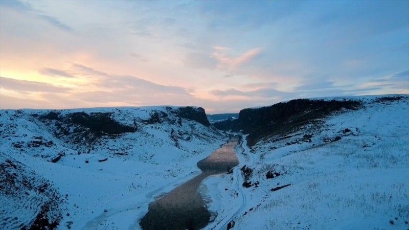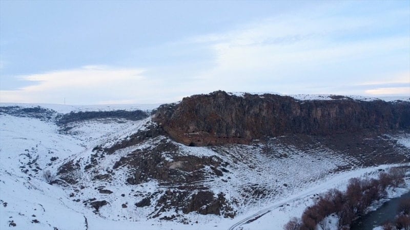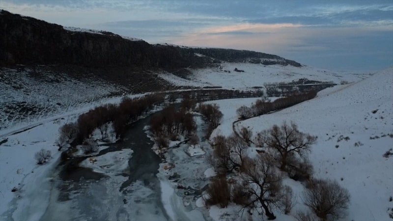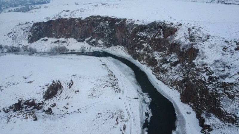 Kars’ta sarp kayalıkları ve vadisiyle dikkat çeken Akyaka Kanyonu, beyaz örtüyle kaplandı. Kış manzarası drone kamerasına yansıdı.
