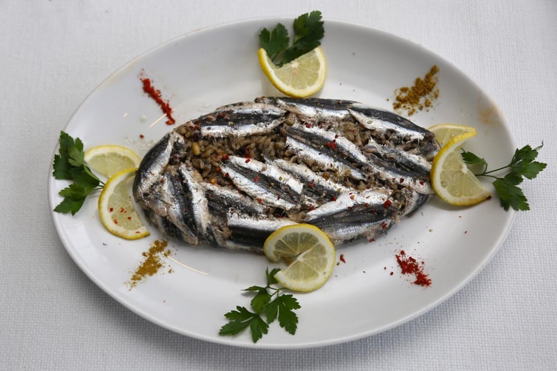 Hamsili pilav bölgeye özgü, deniz ürünlerinde klasikleşmiş yemeklerden biridir. Taze hamsiler ile çevrelenen iç pilav harcı; soğan, kuş üzümü, dolmalık fıstık gibi çeşitli malzemelerle hazırlanır. Pilavın üzerine dikkatle dizilen hamsiler görüntüsüyle de görsel şölen sunar.