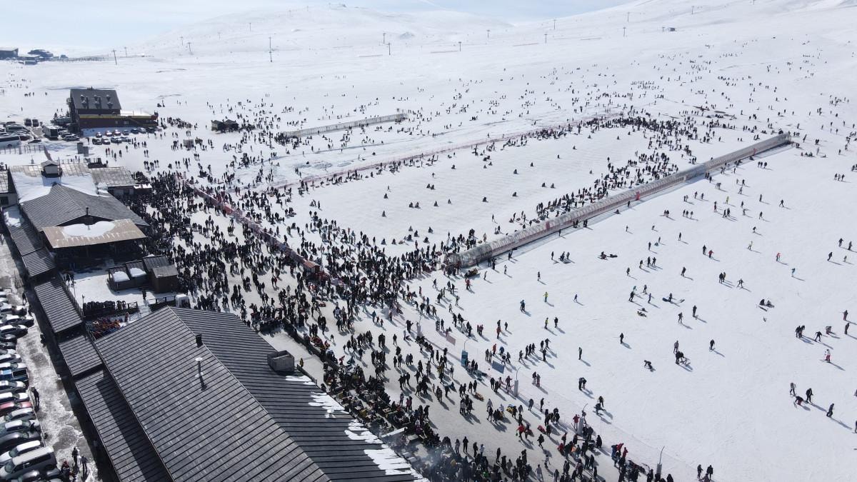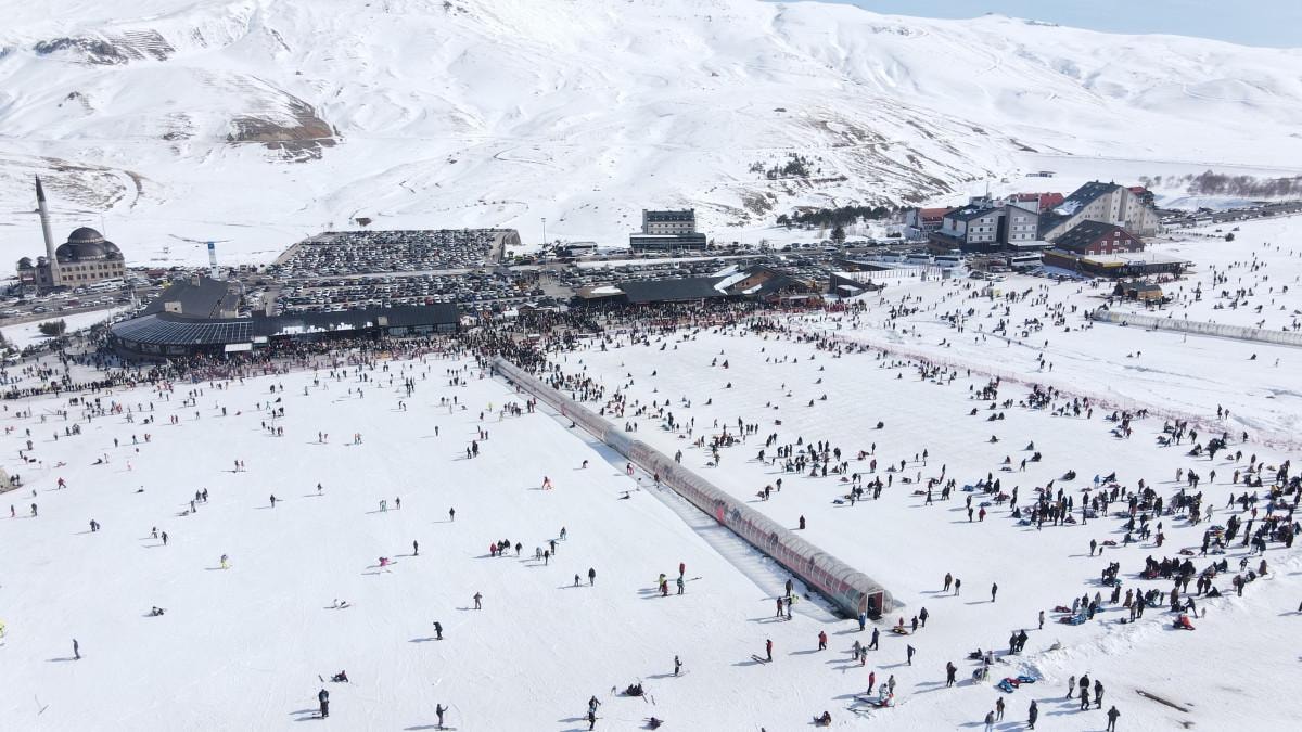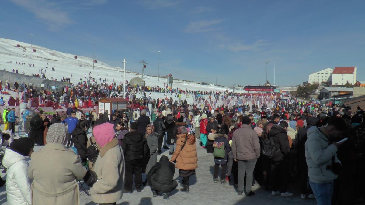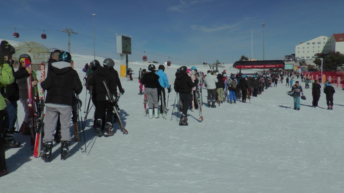 Binlerce kayakseverle dolan Erciyes’te teleferik sırasında da uzun kuyruklar oluştu.