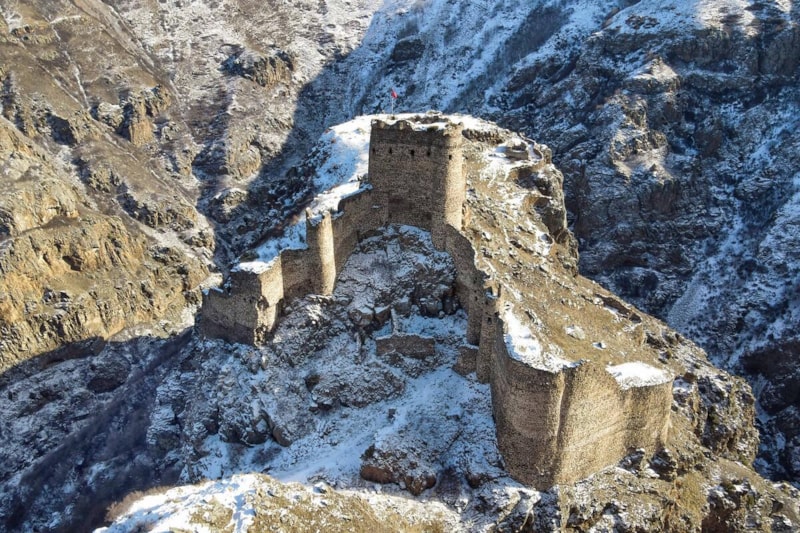 Kaleden, çevredeki vadiler ve Kura Nehri’nin uzanan manzarası izleniyor.