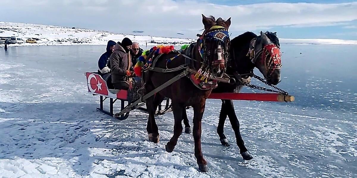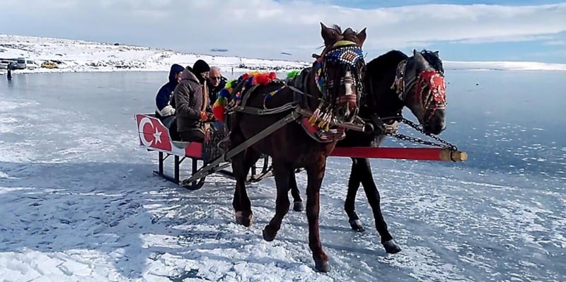 Doğu Anadolu’nun en büyük tatlı su göllerinden biri olan Çıldır, kış aylarında tamamen donuyor.