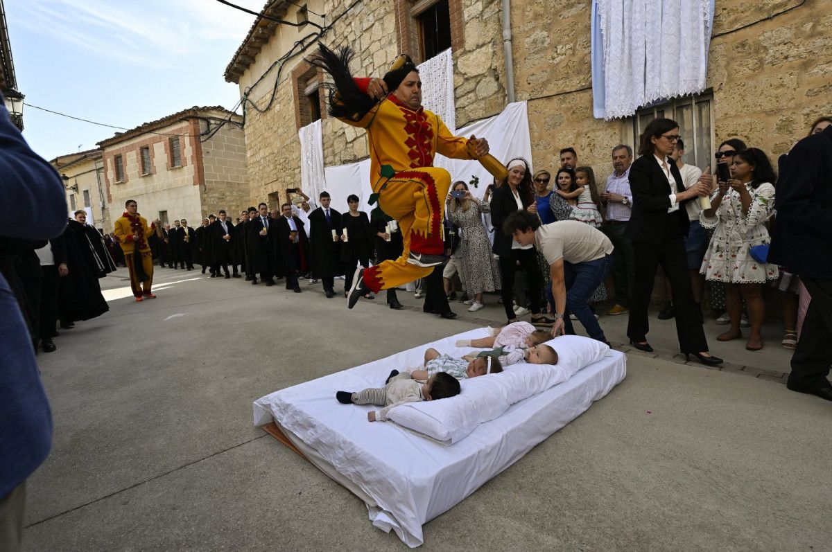 Castrillo de Murcia köyünde yapılan festivalde, "şeytan" kostümü giymiş kişiler bebeklerin üzerinden atlayarak onları kötülüklerden arındırıyor.