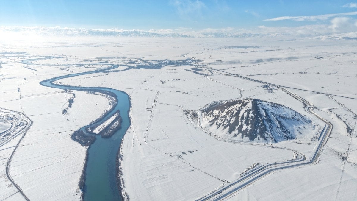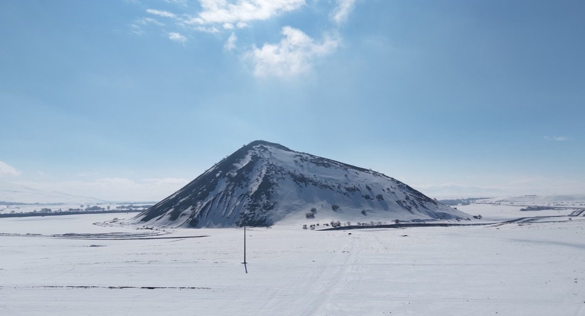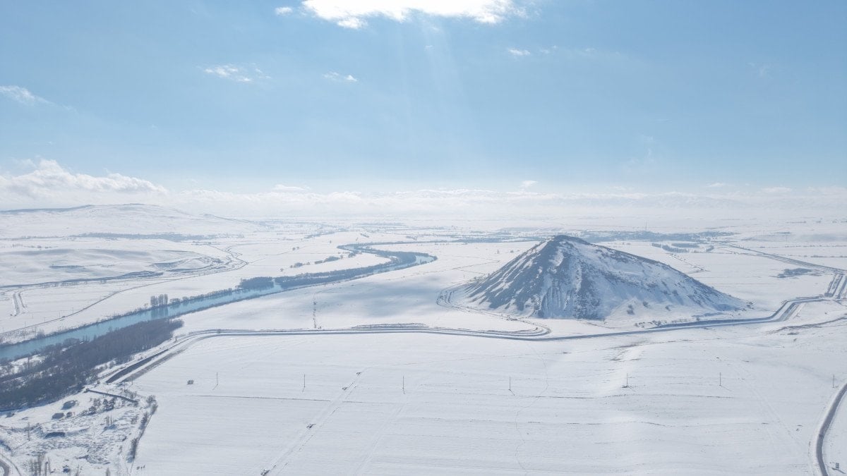 Murat Nehri kıyısında yer alan ve uzaktan bakıldığında piramidi andıran yapısıyla dikkat çeken Mercimek Kale Höyüğü, kar yağışının ardından ortaya çıkan görüntülerle adeta kartpostalları aratmadı. Beyaz örtüyle bütünleşen tarihi alan, fotoğraf tutkunları için de eşsiz kareler sundu.