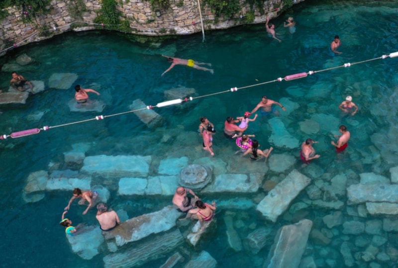 Pamukkale'de, 2 bin 800 yıllık olduğu değerlendirilen antik termal havuz da ziyaretçilere tarihi sütunların içinde yüzme deneyimi sunuyor.