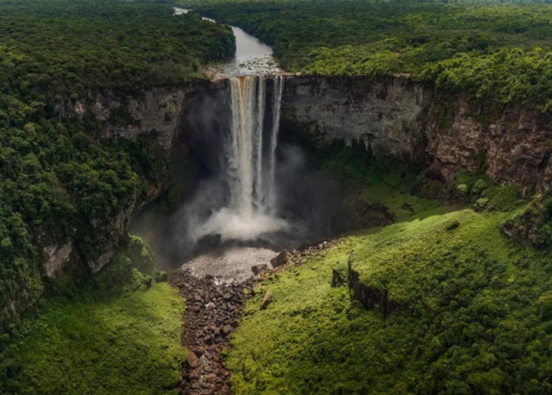 Kaieteur Falls, ormanlık alanlar ve sarp kayalıklar arasında yer alıyor, nispeten az ziyaretçi almasıyla vahşi bir deneyim sunuyor.