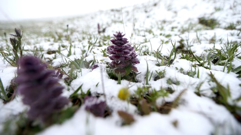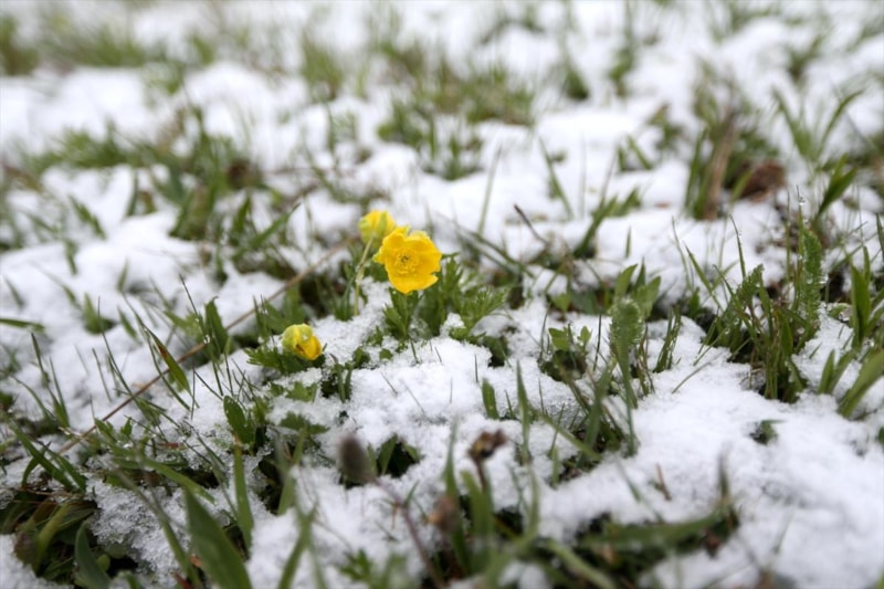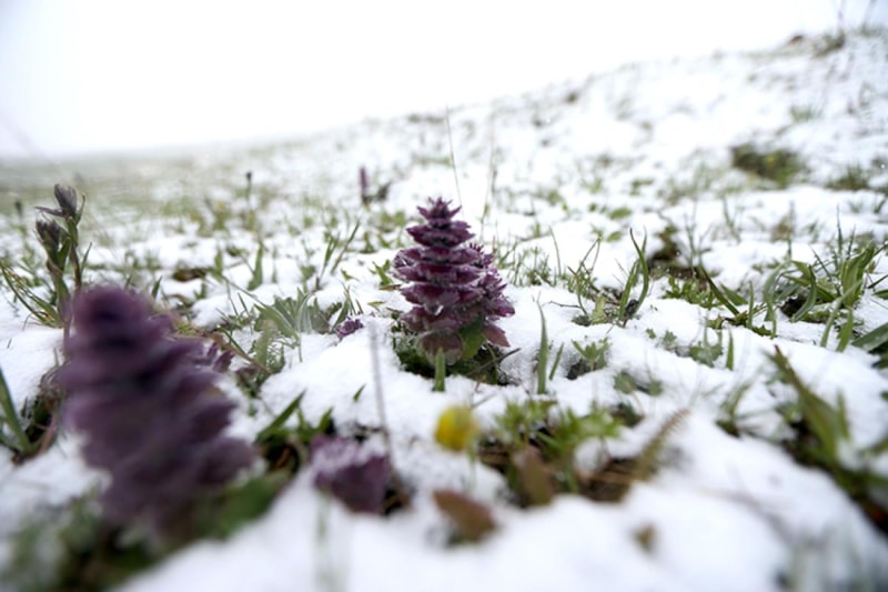 Benzer görüntüler Kars merkezine bağlı, 2 bin 344 metre rakıma sahip Boğatepe Geçidi’nde de yaşandı. Geçitteki çiçekler kar altında kalırken, doğa adeta yeniden kış uykusuna büründü.