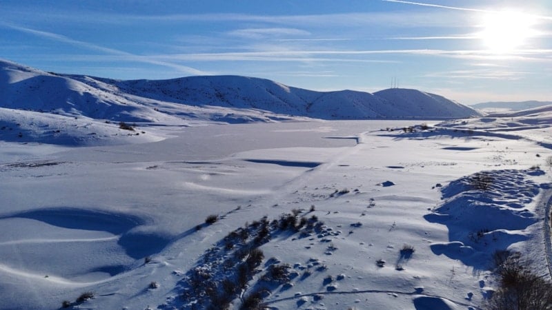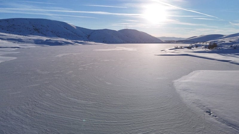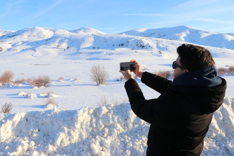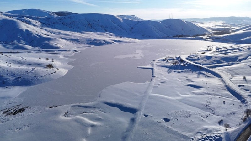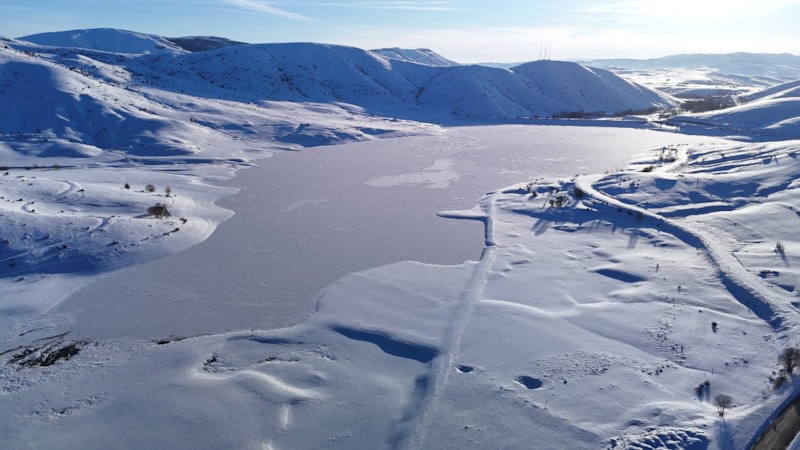 Kent merkezine yaklaşık 50 kilometre uzaklıkta, 2 bin 552 metre rakıma sahip Yıldız Dağı’nın güney yamacında bulunan gölet, çevresini saran dağ silsilesiyle birlikte görsel bir şölen sundu. Donan gölet, bölgenin sert kış koşullarını bir kez daha gözler önüne serdi.