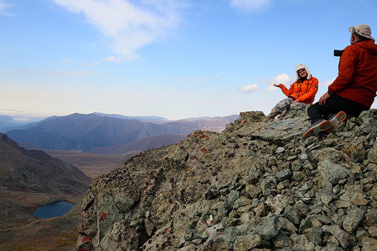 Zorlu geçen 10 kilometrelik yolculuğun sonunda zirveye ulaşan ziyaretçiler, farklı noktalarda bulunan ve adeta mavi boncuğa benzeyen gölleri aynı kadrajda fotoğraflama imkanı yakaladı.