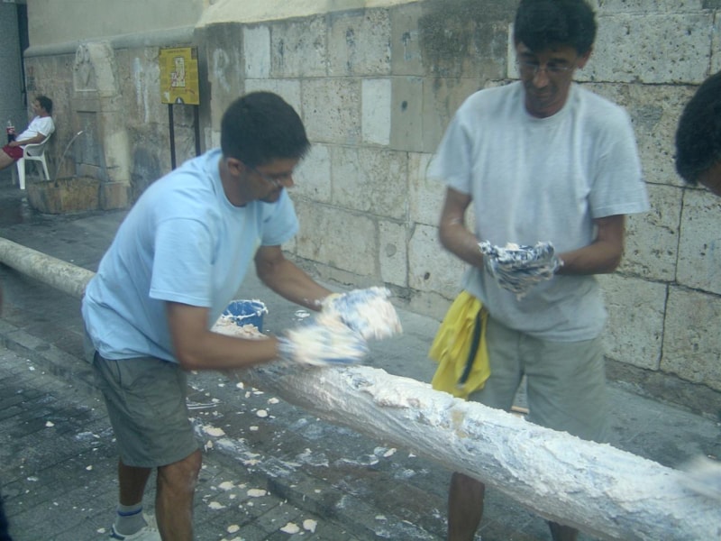 Katılımcılar, yağlanmış uzun bir direğin tepesine yerleştirilen jambonu indirmeye çalışıyor. Jambon yere düştüğünde domates savaşı resmen başlıyor.