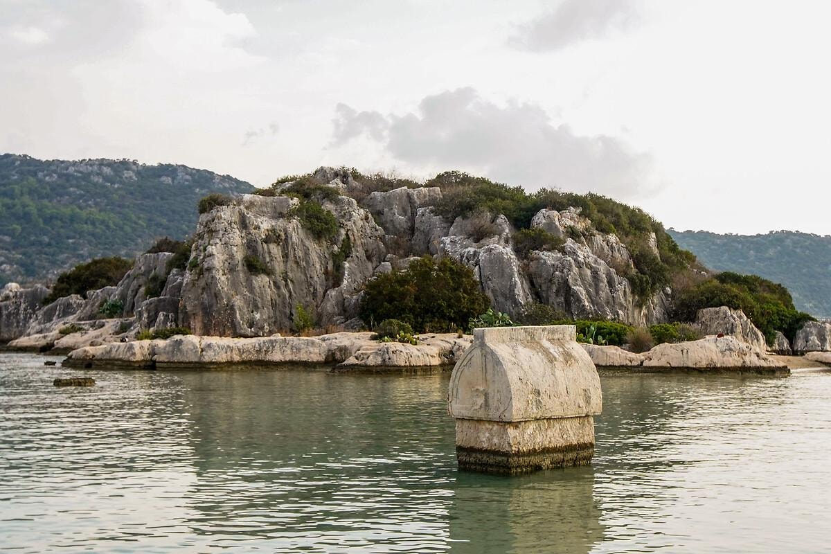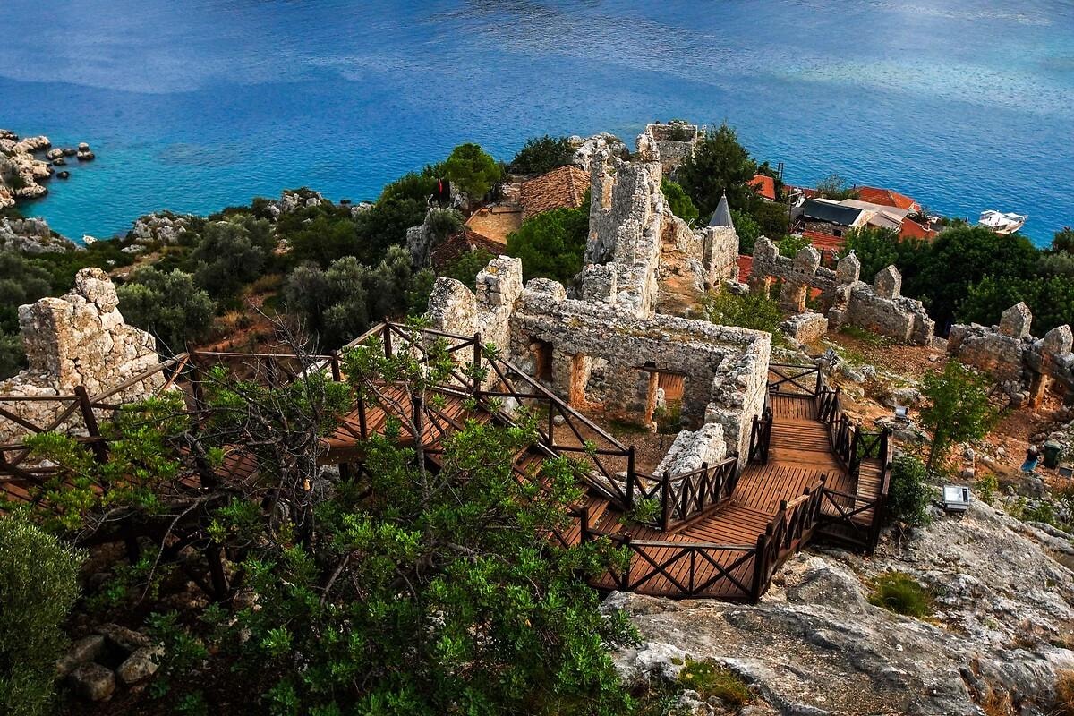 Akdeniz kıyısındaki Kekova bölgesi, depremler ve deniz seviyesindeki değişimler sonucunda kısmen sular altında kalmış antik yerleşimleriyle tanınıyor.