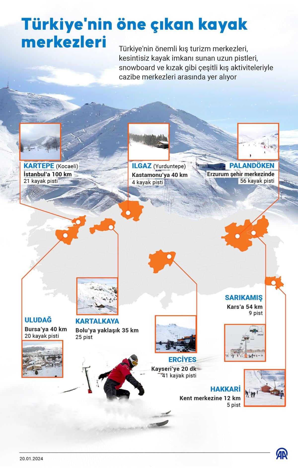 Türkiye'nin öne çıkan kayak merkezleri Kartepe, Ilgaz, Palandöken, Uludağ, Kartalkaya, Erciyes, Sarıkamış ve Hakkari olarak sıralanıyor.