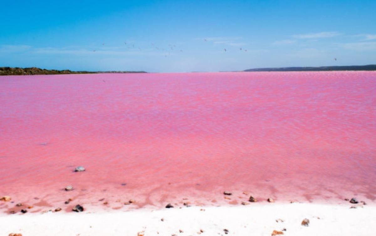 Orta kısmı pembe, çevresi yeşil orman ve maviliklerle çevrili bu göl, görsel bir doğa mucizesi.