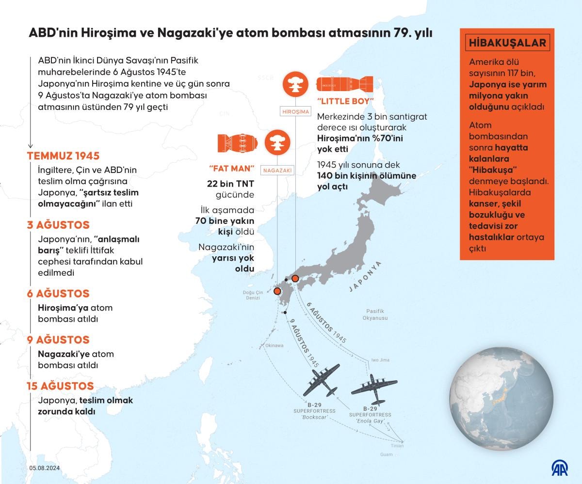 6 Ağustos 1945'te, ABD'nin "B-29" tipi uçağı, "Küçük Çocuk" (Little Boy) adını taşıyan bombayı, 08.15'te 255 bin kişinin yaşadığı Hiroşima'ya bıraktı. Bu uranyum katkılı bomba, 13 bin TNT kuvvetine sahipti ve Hiroşima'nın yüzde 70'ini yok ederek 1,5 kilometre çapındaki bir alanı dümdüz etti. Şehirdeki 90 bin binadan 60 binden fazlası yerle bir oldu.
