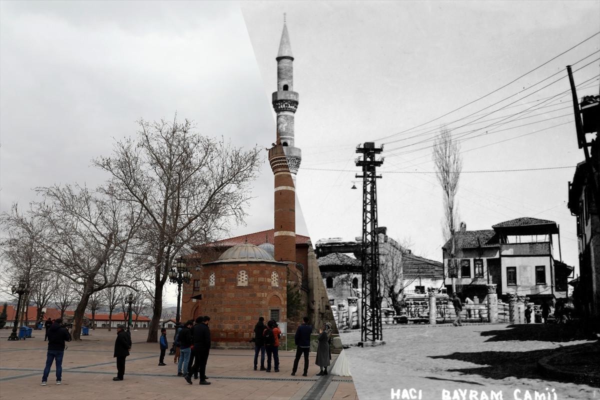 Hacı Bayram Veli Camisi, türbesi, Augustus Tapınağı ve tapınağın yanındaki açık hava müzesi, 1945 tarihli siyah-beyaz fotoğrafta görülürken, günümüze ait karede cami dayanıklılığını korumaya devam ediyor.