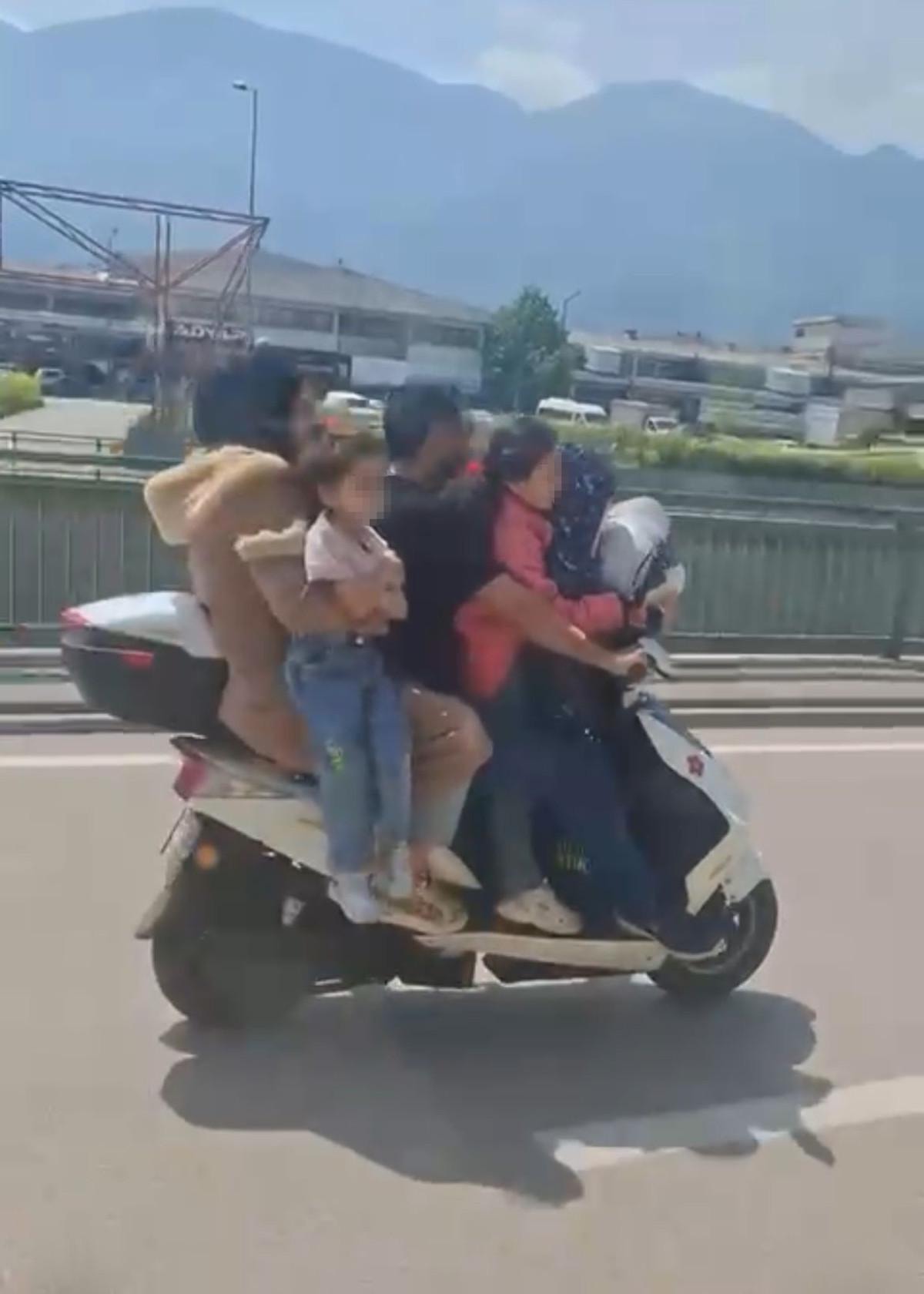 Bursa’nın Yıldırım ilçesinde, şehir içi trafikte motosikletle tehlikeli bir yolculuk gerçekleştiren 5 kişilik aile, görenleri hayrete düşürdü.