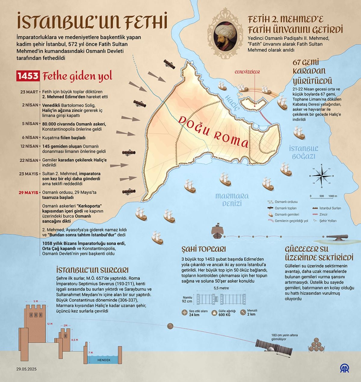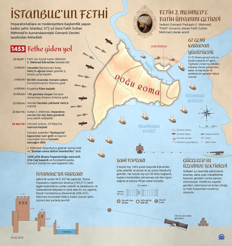 29 Mayıs 1453'te kapıları açılan İstanbul, Sultan 2. Mehmed'in önderliğindeki Osmanlı birlikleri tarafından fethedildi.