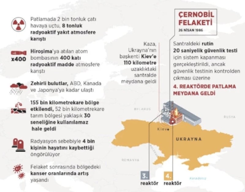 Çernobil Nükleer Santrali’nin dördüncü reaktöründe yaşanan patlama sonucu çevreye, 1945’te Hiroşima’ya atılan atom bombasının 50 katına eşit miktarda radyasyon yayıldı.