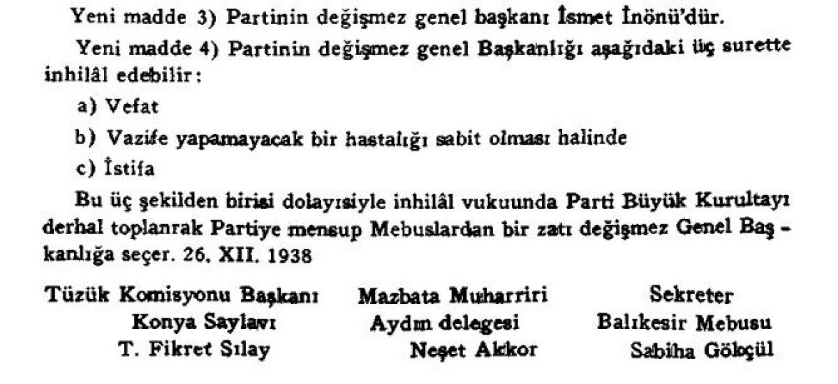 CHP’nin 1. Olağanüstü Kurultayı’nda alınan bir diğer kararda da genel başkanın hangi durumlarda değişeceği, daha doğrusu “değiştirilemeyeceği” belirlenmişti. Kurultayın onayına sunulan tüzük değişikliğine göre partinin “Değişmez Genel Başkanlığı” sadece üç şekilde boşalabilecekti. Bu üç durum, “vefat, vazife yapamayacak hastalık ve istifa” olarak sıralanmıştı. Kurultay delegelerinin oy birliğiyle kabul edilen bu değişiklikle İsmet İnönü, yalnız devletin başı değil, tek partili siyasi iktidarın da değişmez başkanı oluyordu. Aynı kurultayda Partinin Genel Başkan Yardımcılığına Başbakan Celal Bayar, Genel Sekreterliğine de İçişleri Bakanı Refik Saydam getirilmişti.